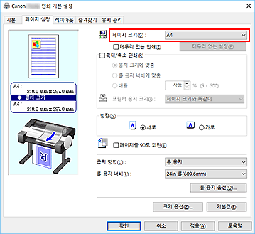 페이지 설정(Page Setup) 탭의 페이지 크기(Page Size) 목록에서 프린터에 로드된 용지의 크기를 선택합니다.