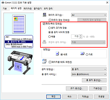 확대/축소 인쇄(Enlarged/Reduced Printing) 확인란을 선택하고 롤 용지 너비에 맞춤(Fit Roll Paper Width)을 선택합니다.
