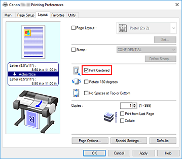 Marque a caixa de seleção Imprimir centralizado (Print Centered) na guia Layout.