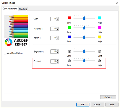 Na guia Ajuste de Cores (Color Adjustment), mover o controle deslizante de Contraste (Contrast) para a direita faz aumentar o contraste, enquanto que, para a esquerda, o reduz.
