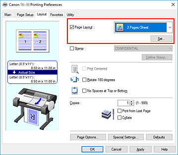 Na guia Layout, marque a caixa de seleção Layout da Página (Page Layout) e, pelo menu suspenso, selecione 2 páginas/folhas (2 Pages/Sheet), 4 páginas/folhas (4 Pages/Sheet), 6 páginas/folhas (6 Pages/Sheet), 8 páginas/folhas (8 Pages/Sheet), 9 páginas/folhas (9 Pages/Sheet) ou 16 páginas/folhas (16 Pages/Sheet).