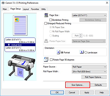 - Para definir um tamanho de papel superdimensionado para um tamanho não padrão, registre esse tamanho na caixa de diálogo Opções de tamanho do papel (Paper Size Options). Um tamanho de papel superdimensionado não pode ser definido na caixa de diálogo Configurações de tamanho personalizado (Custom Size Settings).