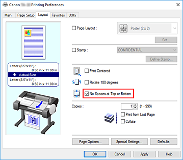 Na guia Layout, marque a caixa de seleção Sem espaç. na sup. ou inf. (No Spaces at Top or Bottom).
