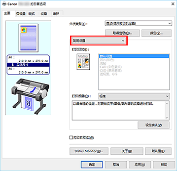 从下拉菜单中选择简易设置,然后从打印目的列表中选择符合使用目的的设置。