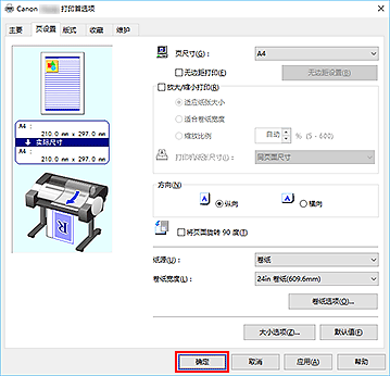 注释- 如果未在打印机上设置介质类型和输出纸张尺寸,则确定将显示为灰色且无法单击。