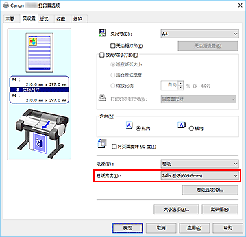如果将纸源选择为卷纸,请将卷纸宽度设置为装入打印机的卷纸宽度。