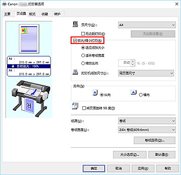 - 当用于创建原稿的应用程序软件具有比例打印功能时,请在该应用程序软件上配置此设置。 您无需在打印机驱动程序中配置相同的设置。