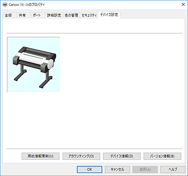 [デバイス情報]ダイアログボックスでは、接続しているプリンターのデバイス情報を取得し、ドライバーの機能を接続しているプリンターに合った構成に変更することができます。