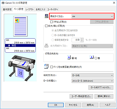 [ページ設定]シートの[用紙サイズ]で、印刷したい用紙サイズを選びます。