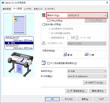 • [カスタムサイズ]で設定した用紙サイズは、アプリケーションソフトを終了すると無効になります。