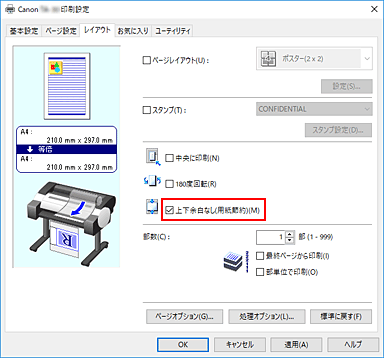 [レイアウト]シートの[上下余白なし(用紙節約)]にチェックマークを付けます。