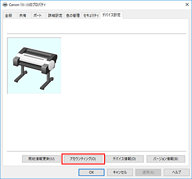 プリンターのプロパティ画面が表示されます。[デバイス設定]シートの[アカウンティング]をクリックする