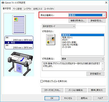 [基本設定]シートの[用紙の種類]で、プリンターにセットしている用紙の種類と同じものを選びます。