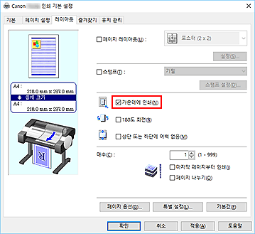 - 페이지 설정(Page Setup) 탭의 확대/축소 인쇄(Enlarged/Reduced Printing)에서 배율(Scaling)을 사용하여 배율을 설정한 후 인쇄하는 경우 항상 페이지의 왼쪽 위 모서리의 고정된 점을 시작으로 확대/축소됩니다. 따라서 축소하여 인쇄하는 경우 용지의 아래쪽 및 오른쪽 여백이 늘어납니다. 이때 레이아웃(Layout) 탭의 가운데에 인쇄(Print Centered) 옆에 있는 확인란을 선택하면 상하좌우 여백을 동일하게 인쇄할 수 있습니다.