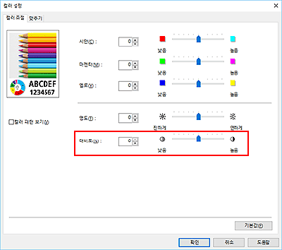 컬러 설정(Color Settings) 대화 상자가 나타납니다.대비도 조절