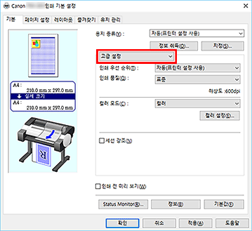 중요- 용지 종류(Media Type)에서 자동(프린터 설정 사용)(Auto (Use Printer Settings))을 선택하면 사용자 정의(Custom)를 선택할 수 없습니다.