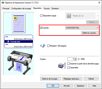 - En fonction de l'environnement d'utilisation, vous ne serez peut-être pas en mesure d'utiliser la fonction Cachet. Dans ce cas, définissez le paramètre Tampon au niveau du pilote d'imprimante dans la boîte de dialogue Réglages spéciaux sur Oui.