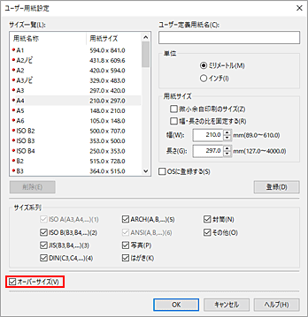- 定形外の用紙に対してオーバーサイズの用紙サイズを設定する場合は、[ユーザー用紙設定]ダイアログボックスで用紙サイズを登録してください。[カスタムサイズ設定]ダイアログボックスで設定した用紙サイズでは、オーバーサイズの用紙サイズの設定はできません。