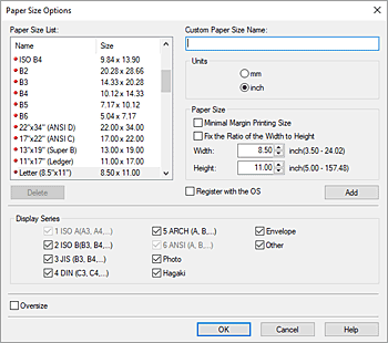 Para estreitar os tamanhos de papel exibidos em Lista de tamanhos de papel (Paper Size List), marque a caixa de seleção Exibir séries (Display Series).