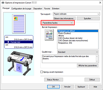 Dans le menu déroulant, sélectionnez Paramètres faciles, puis sélectionnez le paramètre correspondant à vos besoins dans la liste But de l'impression.