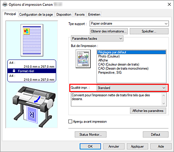 Définissez la Qualité d'impression sur Haute, Standard ou Brouillon selon vos besoins.
