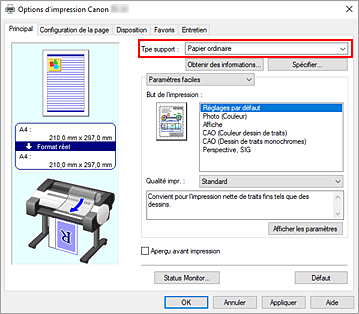 Les paramètres périphérique actuels de l'imprimante apparaissent dans les paramètres type de papier et format de papier.Appliquez les paramètres