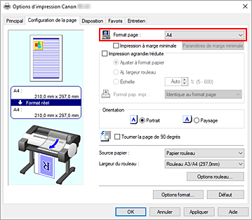 Dans la liste Format page de l'onglet Configuration de la page, sélectionnez le même format que celui du document créé avec le logiciel d'application.