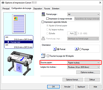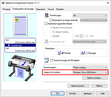 Si vous sélectionnez un papier rouleau dans Source papier, renseignez la largeur du papier rouleau chargé dans l'imprimante sous Largeur du rouleau.