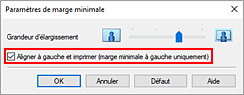 Lorsque la boîte de dialogue Paramètres de marge minimale s'affiche, cochez l'option Aligner à gauche et imprimer (marge minimale à gauche uniquement), puis cliquez sur OK.