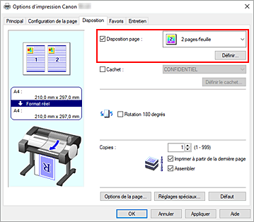 La fonction d'impression mise en page permet d'imprimer plus d'une image de page sur une seule feuille de papier.