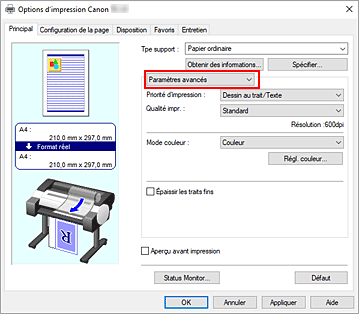 Remarque- Le Mode couleur disponible pour sélection dépend du type de support sélectionné pour Type papier dans l'onglet Principal.