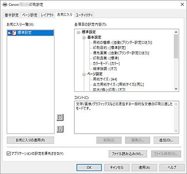 現在の印刷の設定をお気に入りの設定として登録できます。 - [アプリケーションの設定を優先させる]