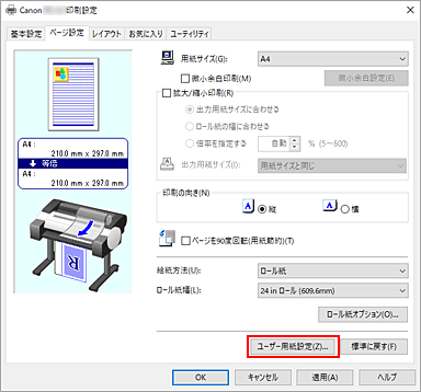 [ユーザー用紙設定]ダイアログボックスが表示されます。
