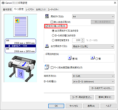 - 原稿を作成したアプリケーションソフトに拡大縮小印刷機能がある場合は、アプリケーションソフトで設定してください。プリンタードライバーで設定する必要はありません。