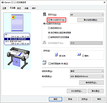 有关如何调整卷纸最小边距量的说明,请参阅“执行最小边距打印时设置最小边距量”。 - 使用最小边距打印时,打印设置会自动优化,更改为更合适的设置。因此,即使打印设置有变更,但打印结果可能是相同的。