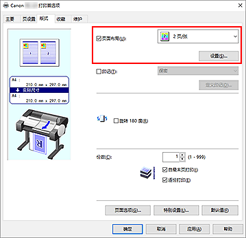 在版式选项卡上,选中页面布局复选框,然后从下拉菜单中选择2 页/张、4 页/张、6 页/张、8 页/张、9 页/张或16 页/张。