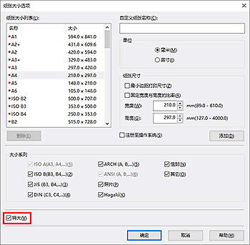 - 要为非标准纸张尺寸设置超大纸张尺寸,请在纸张大小选项对话框中注册纸张尺寸。 无法为在自定义大小设置对话框中设置的纸张尺寸设置超大纸张尺寸。
