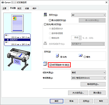 - 从页设置选项卡中选择页尺寸为纵向格式的纸张时,如果垂直方向上的长度超过在卷纸宽度中选定的宽度,则即使在将页面旋转 90 度旁添加复选标记,也不会旋转该页面。