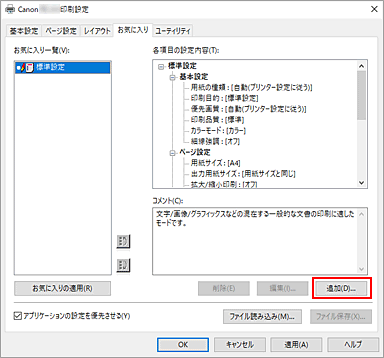- 現在の印刷設定に適用されているお気に入りの設定は削除できません。[お気に入り一覧]から他のお気に入りを選んで[お気に入りの適用]をクリックし、他のお気に入りの設定を適用してから削除を行ってください。
