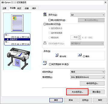 从页设置选项卡的页尺寸列表中,选择与使用应用程序软件创建的文档相同的尺寸。