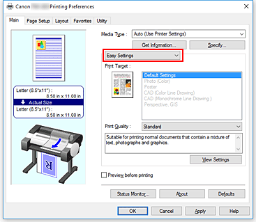 Wählen Sie im Pull-Down-Menü die Option Einfache Einstellungen (Easy Settings) aus, und wählen Sie dann aus der Liste Druckziel (Print Target) die Einstellung aus, die Ihrem Zweck am besten entspricht.