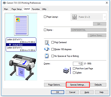 2. Auswählen von Sondereinst.... (Special Settings...) auf der Registerkarte Layout