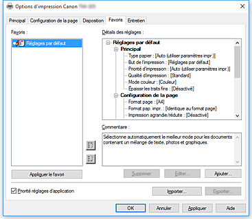 L'onglet Favoris vous permet d'enregistrer les paramètres d'impression les plus fréquemment utilisés en tant que favoris.