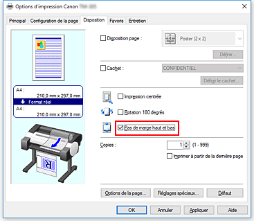 Lorsque vous imprimez sur un rouleau de papier, vous pouvez économiser du papier en réduisant les marges supérieure et inférieure lors de l'impression.