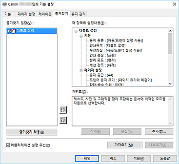 즐겨찾기(Favorites) 탭에서는 자주 사용하는 인쇄 설정을 즐겨찾기로 등록할 수 있습니다.
