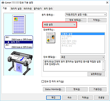- 프린터 드라이버의 용지 설정이 프린터에 등록된 용지 정보와 다른 경우 프린터 조작판에 오류 메시지가 나타날 수 있습니다. 인쇄를 실행할 수는 있지만 올바른 인쇄 결과를 얻지 못할 수 있습니다.