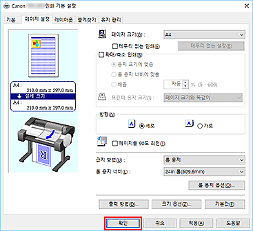 참고- 프린터에 용지 종류와 출력 용지 크기가 설정되지 않은 경우, 확인(OK)은 회색으로 표시되고 클릭할 수 없습니다.