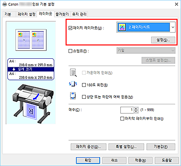 중요- 페이지 설정(Page Setup) 탭에서 배너 인쇄(Banner Printing) 확인란을 선택한 경우 페이지 레이아웃(Page Layout)은 회색으로 표시되고 설정할 수 없습니다.