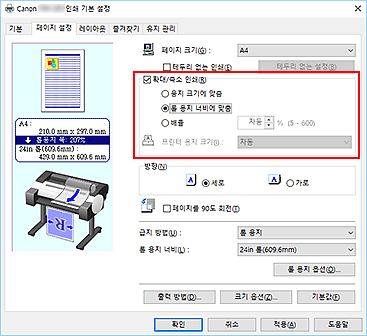 확대/축소 인쇄(Enlarged/Reduced Printing) 확인란을 선택하고 롤 용지 너비에 맞춤(Fit Roll Paper Width)을 선택합니다.