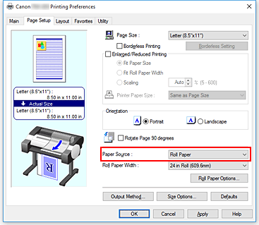 Em Origem do papel (Paper Source), selecione Papel em rolo (Roll Paper).